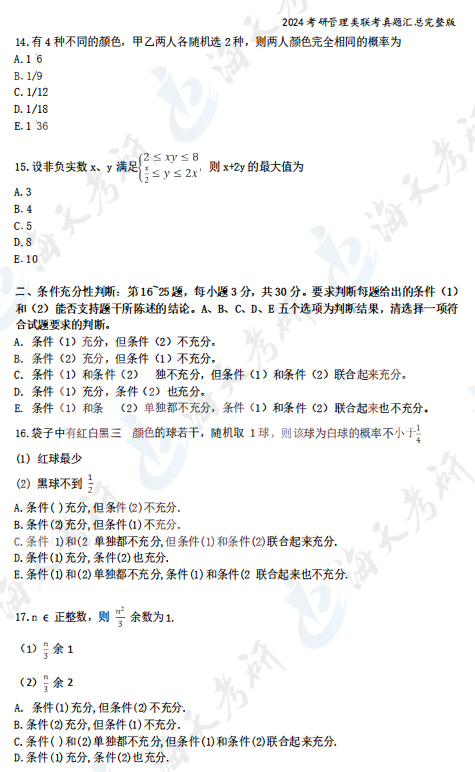 2024全国研究生初试已经全部结束,2024管理类综合能力大家考的怎么样呢?知道大家都在关注2024考研真题及答案解析,海天考研网为各位考生带来2024管综199考研真题完整版,包括管综199问题求解、条件充分性判断、逻辑推理、论证有效性分析和论说文写作,助力各位学子考研初试后核对答案提前估分,2025考研生也可以提前了解一下。